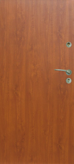 Konstrukcję wewnętrzną drzwi stanowi ożebrowanie, które pokryte zostało stalową ocynkowaną blachą. Skrzydło i ościeżnicę laminowano okleiną o fakturze drewnopodobnej w naturalnych kolorach. Środek drzwi wypełniono samogasnącym styropianem.